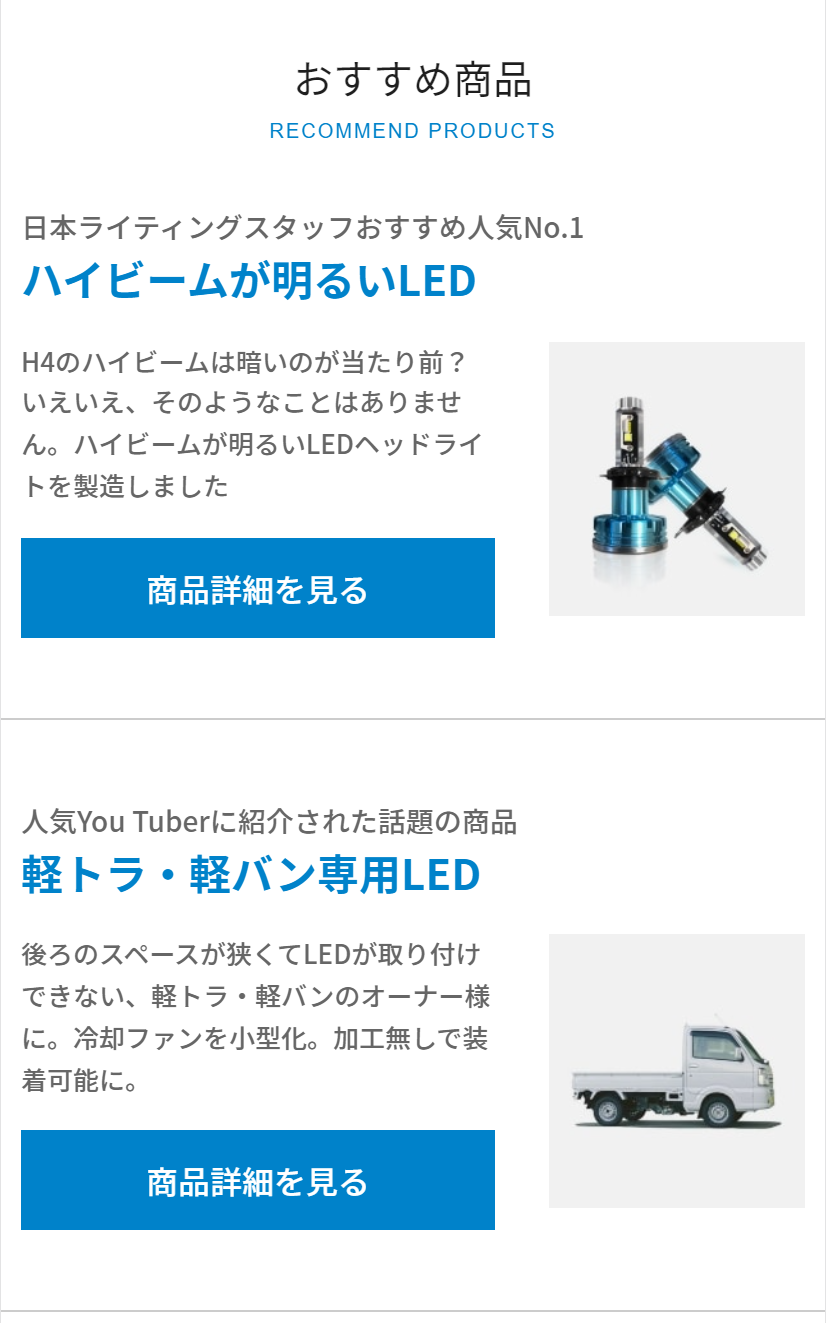 顧客サポートの一環として、同社は製品の取り付けガイドやFAQを提供しており、ユーザーが製品を安心して使用できるようサポートしています。さらに、ユーザーからの問い合わせに対しては、専門的なアドバイスや、場合によっては現地でのサポートを提供することもあります。このように日本ライティングは、単に製品を販売するだけでなく、購入後の顧客経験重視しています。優れた保証体制と顧客サポートは、ユーザーが同社の製品を安心して長期間使用できる大きな理由の一つです。日本ライティングの安全性とエコフレンドリーな取り組み日本ライティングのLEDヘッドライトは、安全性にも配慮されており、適切なカットラインと照射範囲で対向車への眩しさを最小限に抑えています。また、エネルギー効率の良いLEDを使用することで、環境への負担も減らしています。省エネルギーと長寿命を実現することで、より持続可能な照明ソリューションを提供しているのです。このように、日本ライティングのLEDヘッドライトは、その高品質な製品特性と、顧客に寄り添ったサービスにより、多くのドライバーに信頼されています。明るさ、耐久性、安全性、そして環境への配慮といった多角的な観点から、日本ライティングの製品は自動車照明市場において独自の地位を築いています。今後も日本ライティングは、継続的な技術革新と製品改良を通じて、高品質な照明ソリューションを提供し続けることでしょう。その結果、日本国内はもちろんのこと、世界市場においてもその存在感をさらに高めていくことが期待されます。最終的に、日本ライティングのLEDヘッドライトは、多くのユーザーにとって、高いパフォーマンスと優れたコストパフォーマンスを兼ね備えた、理想的な照明選択肢となるでしょう。「SOMPOで乗ーる 夏フェア」: 人気車種を特別価格でリース!「SOMPOで乗ーる 夏フェア」で人気車種を特別価格でリース!夏の限定キャンペーンでお得に車を手に入れるチャンス。HIDより取り付けが簡単で、寿命が長いのが大きなメリットとなり、LEDヘッドライト球を利用される方が増えてきました。 最近では純正でLEDヘッドライトが採用されている車種もあり、LEDのヘッドライト球の購入を検討されている方も多いのではないでしょうか?しかし、純正のヘッドライトの球がハロゲン、HID(ディスチャージランプ)でLEDのヘッドライト球に交換する場合に注意する箇所がいくつかあります。 この記事ではLEDヘッドライト球の車検時の注意点や、車検に通るLED球を選ぶポイントについて解説します。LEDヘッドライト球に交換した場合に、注意しなければならない点は光度がしっかりでているか、カットラインがしっかり確認できるか、灯火の色は適切かです。この点以外にもヘッドライトの車検時に注意する点はありますが、この記事ではLED球に交換した場合に注意する3点のみ解説します。LED=明るいのイメージはあると思います。もちろん明るいのですが、車のヘッドライトの場合、ヘッドライトからの光をうまく反射させることで、より強い光(光度)にしています。ハロゲンやHIDなどは球体になっており、360度全方位に照射しそれをリフレクター(反射面)とレンズで上手に配光する仕組みとなっています。 しかしLEDの光源は球体ではなく、面で発光するため最大でも180度しか照らすことが出来ません。 そのため、ハロゲンやHID用に設計されたライトで使用すると光源をうまく反射できず、結果として光度が出ないことがあります。カットラインとは簡単に言うと路肩側を明るく照らして、対向車側のロービーム上方の光をカットする境界線のことを言います。このカットラインがあるおかげで対向車は幻惑することなく、走行することができています。 このカットラインですが、粗悪品や精度の悪いLED球ではきちんと出ないことがあります。前述の通りLEDは面で発光するため180度しか照らすことが出来ません。 そのためハロゲンやHIDが装着されていたヘッドライトで使用するには、LEDをうまく配列し360度全方位を照らせるようにする必要があります。粗悪品や精度の悪いLEDではこの配列がうまくいかずカットラインが出ないのです。 カットラインが出ていなければそれだけで車検に通りません。灯火の色は適切かヘッドライトの色の規定については白色となっております。この白色ですが、真っ白だけではなく、橙色なども白色の判断となります。 色はケルビン(色温度)という単位で示され、ケルビンが低いと黄色に、高いと青色となります。 ◯ケルビン~◯ケルビンまでなら車検適合などの基準がないため、検査官の主観となりますが、目安として5000~6000ケルビンの製品であれば車検に通る可能性が高いです。では上記の注意点を踏まえ、車検に通る可能性の高いLED球はどのようなものなのでしょうか?国産メーカー品を選ぶLED球は上記の通り180度しか照射できないので、適切な位置にLEDを配列する必要があります。 国産メーカ